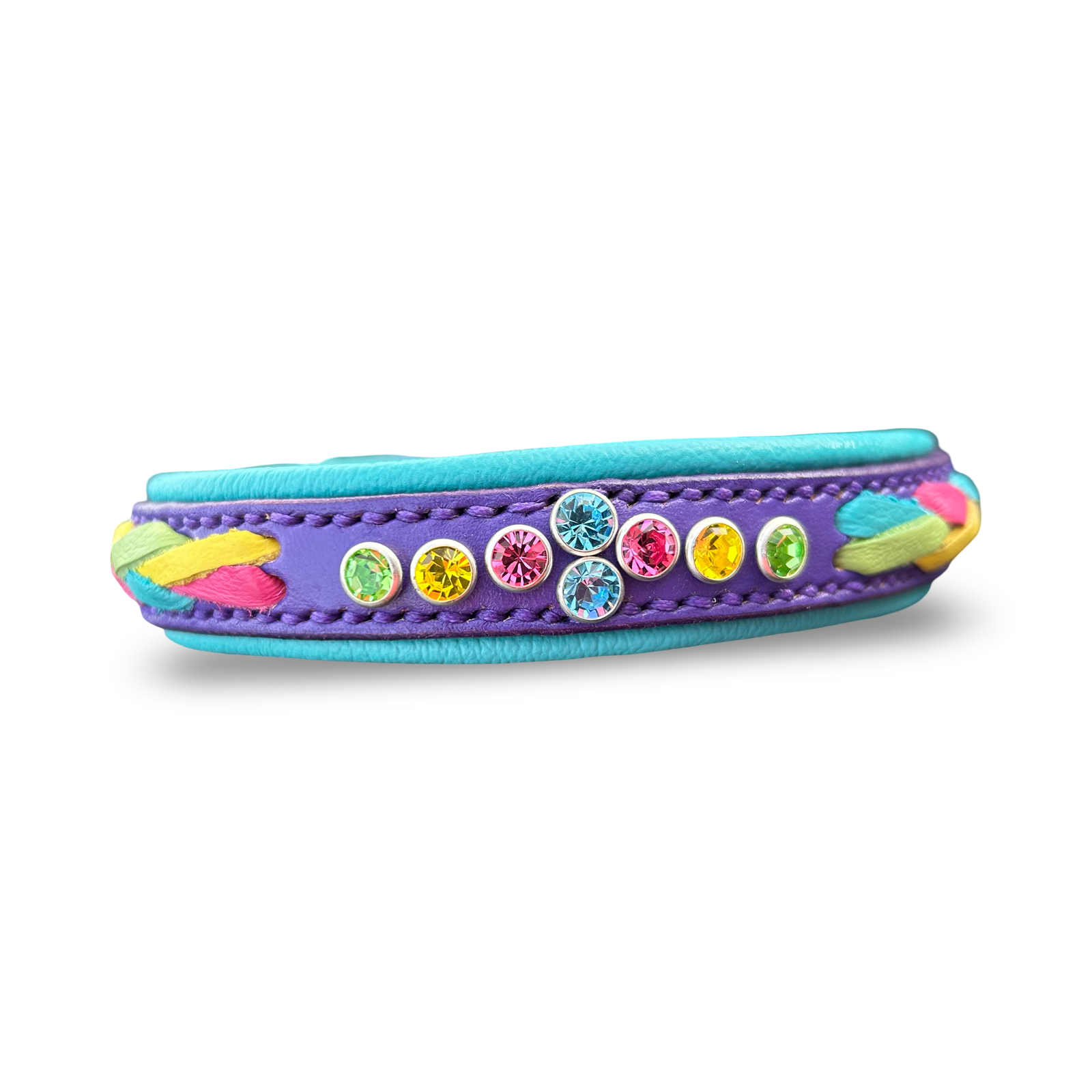 Decorated with yellow ,lime , pink and aqua plaiting and a multi coloured stone centre piece.