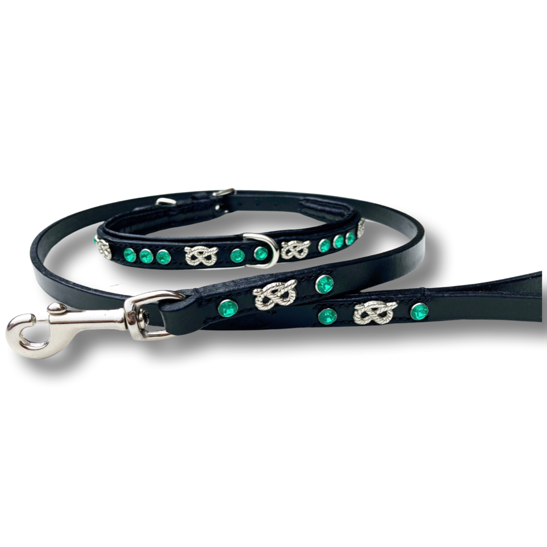 Decorated with emerald stones and silver Stafford knots , with a central dee.