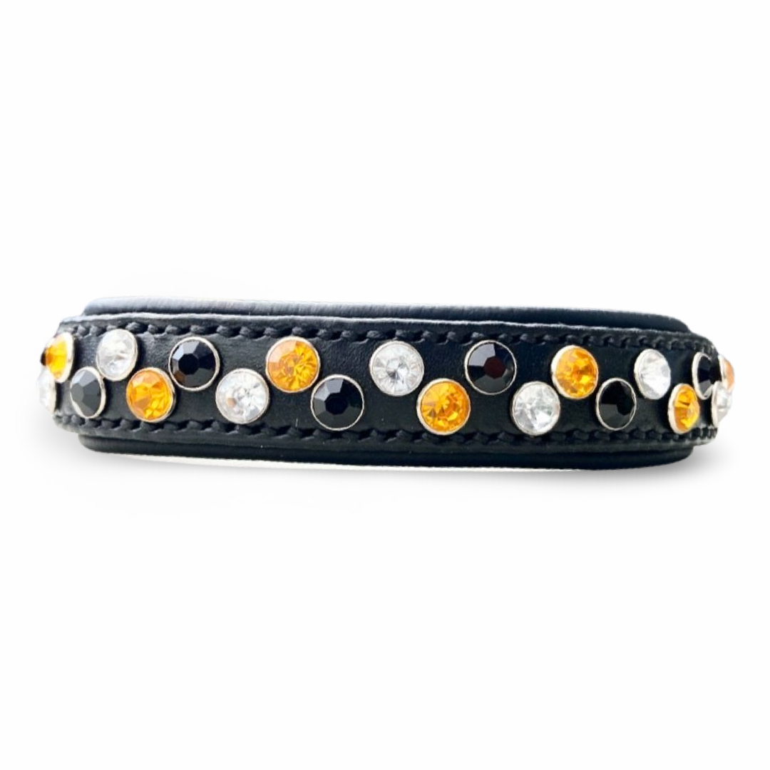 Decorated with Black, Clear and Orange stones in a double row pattern.