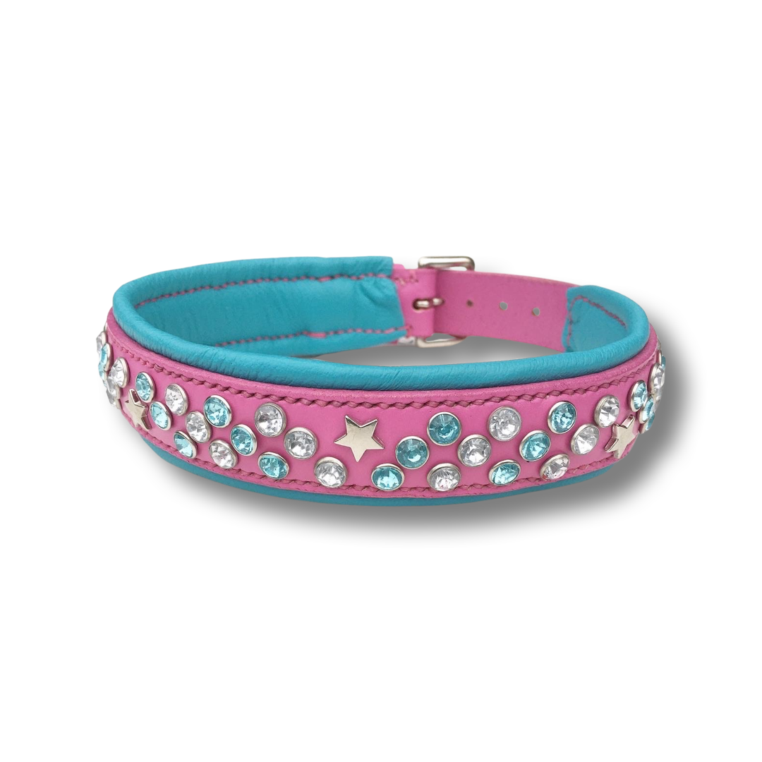 Decorated with aqua and clear stones in a triple row formation, interrupted with silver stars