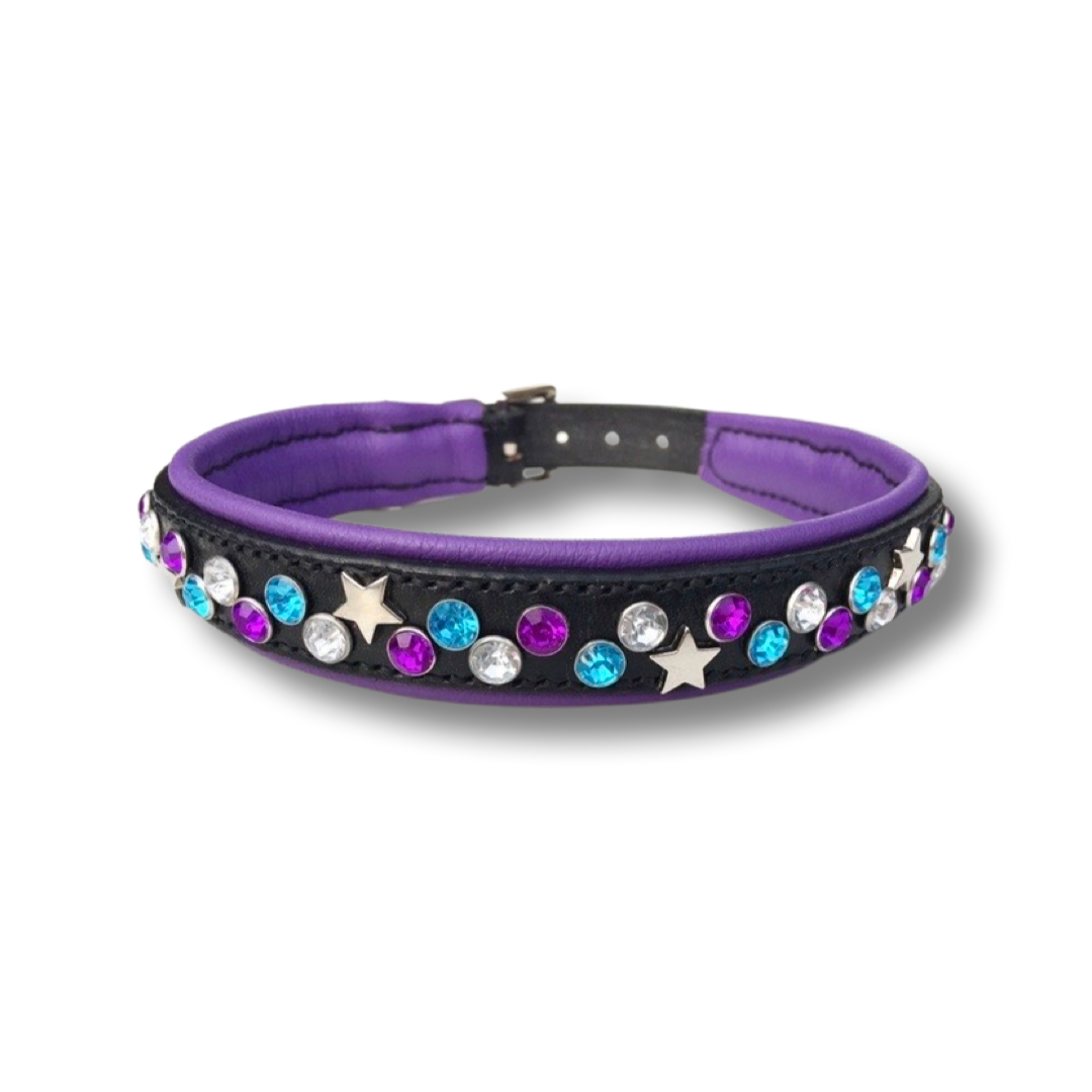 Decorated with turquiose, purple & clear stones in a double row formation. Interrupted with silver stars.