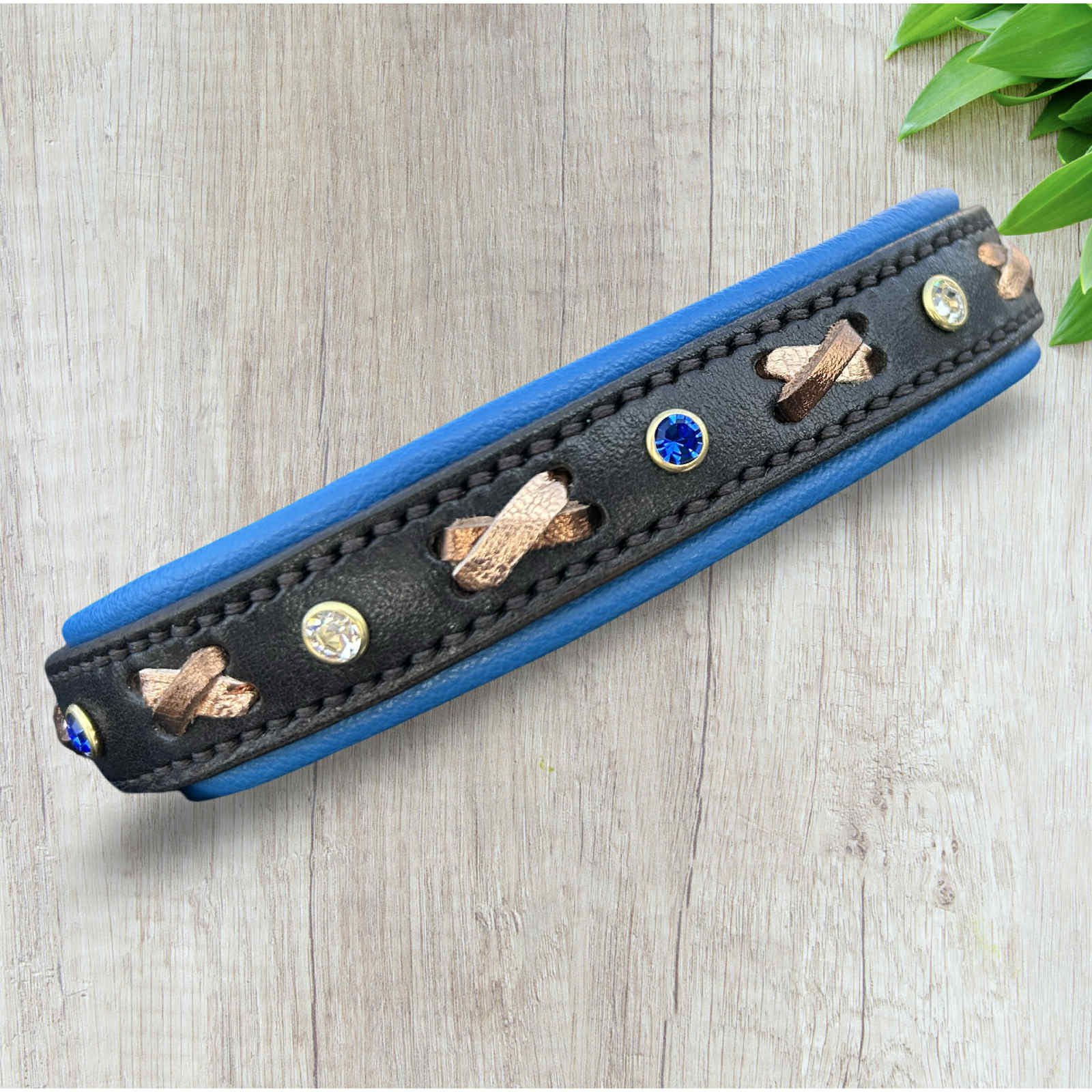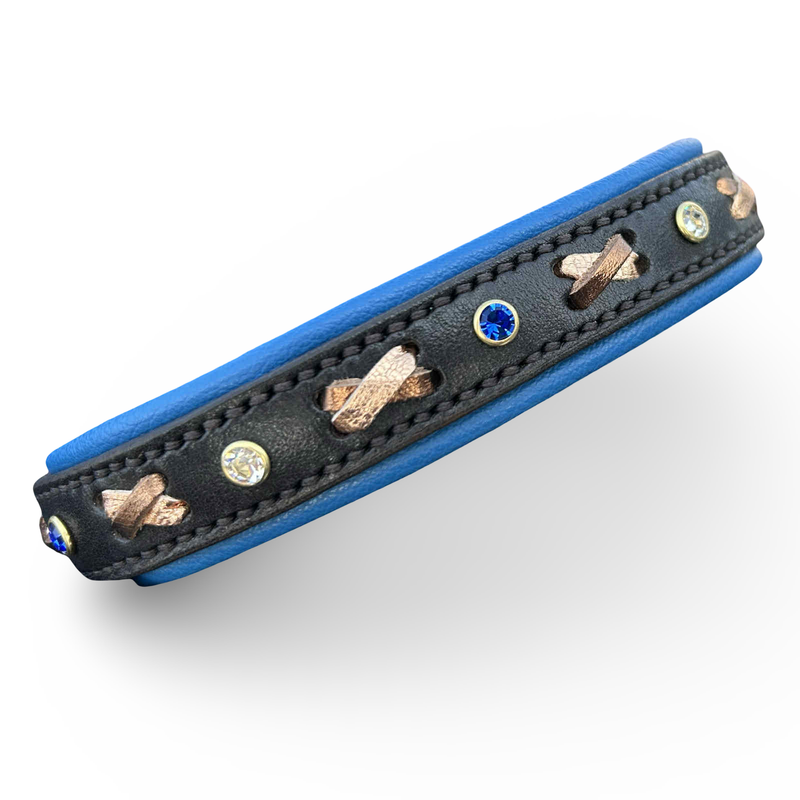 decorated with - clear & royal blue preciosa stones interrupted with rose gold & bronze crosses .